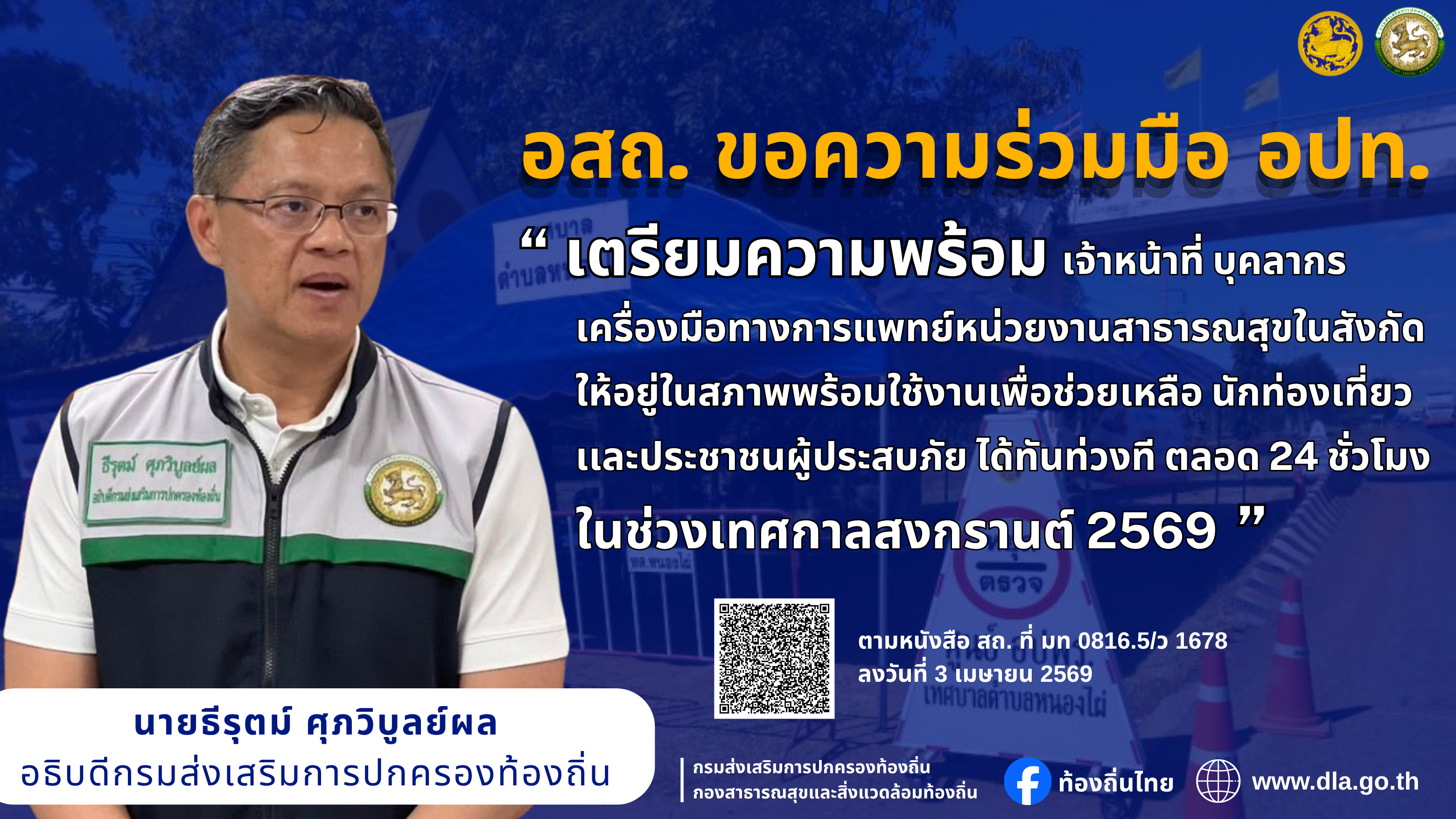 กรมส่งเสริมการปกครองส่วนท้องถิ่นได้รับแจ้งจากกรมส่งเสริมวัฒนธรรม กระทรวงวัฒนธรรม ว่า ได้มีการจัดตั้งคณะกรรมการเพื่อกำหนดแนวทางในการจัดงานสงกรานต์ พุทธศักราช 2569 และประสานความร่วมมือในการบูรณาการแนวทางและมาตรการรณรงค์การจัดกิจกรรมประเพณีสงกรานต์ ส่งเสริม สนับสนุน ดำเนินการกิจกรรม สืบสานประเพณีสงกรานต์ รวมทั้งป้องกันและแก้ไขปัญหาที่อาจจะเกิดขึ้นในประเพณีสงกรานต์ และจัดกิจกรรมน้อมสำนึกในพระมหากรุณาธิอคุณ สมเด็จพระนางเจ้าสิริกิติ์พระบรมราชินีนาถ พระบรมราชชนนีพันปีหลวง ในช่วงจัดการประเพณีสงกรานต์ ภายใต้หัวข้อ (THEME) "สงกรานต์บ้านฉัน สีสันแบบไทย สุขไกลทั่วโลก" Once in a life time : Experience Songkran in Thailand โดยกำหนดแนวทางการส่งเสริมแบ่งออกเป็น 4 มิติ ได้แก่ 1.มิติด้านวัฒนธรรม 2.มิติด้านเศรษฐกิจ 3.มิติด้านสังคม 4.มิติด้านสิ่งแวดล้อม จึงของแจ้งให้องค์กรปกครองส่วนท้องถิ่น ดำเนินการตามแนวทางและเชิญชวนประชาชนและนักท่องเที่ยวสืบสานประเพณีสงกรานต์