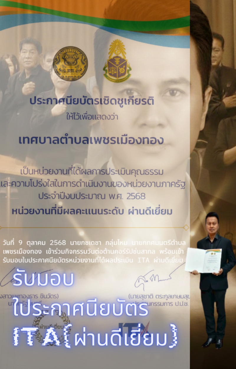วันที่ 9 ธันวาคม 2568 นายกเทศมนตรีตำบลเพชรเมืองทอง เข้ารับมอบประกาศนีบบัตรเชิดชูเกียรติรางวัลการประเมินคุณธรรมและความโปร่งใสในการดำเนินงานของหน่วยงานภาครัฐ ประจำปีงบประมาณ พ.ศ. 2568 (่ผ่านดีเยี่ยม) ณ หอประชุมองค์การบริหารส่วนจังหวัดอ่างทอง พร้อมเข้าร่วมกิจกรรมงานวันต่อต้านคอรัปชั่นสากล