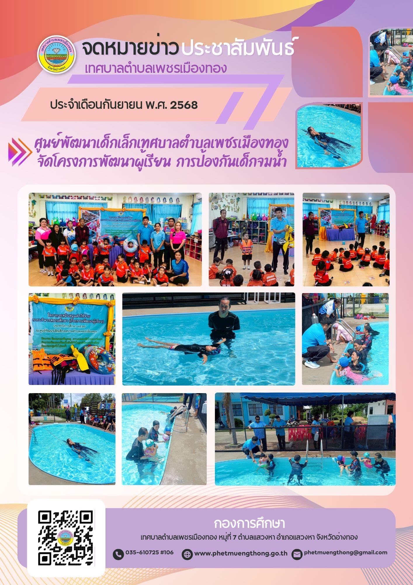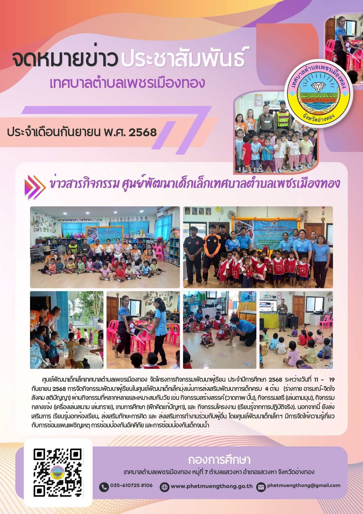 ศูนย์พัฒนาเด็กเล็กเทศบาลตำบลเพชรเมืองทอง จัดโครงการกิจกรรมพัฒนาผู้เรียน ประจำปีการศึกษา 2568 ระหว่างวันที่ 11 - 19 กันยายน 2568 การจัดกิจกรรมพัฒนาผู้เรียนในศูนย์พัฒนาเด็กเล็กมุ่งเน้นการส่งเสริมพัฒนาการเด็กครบ 4 ด้าน (ร่างกาย อารมณ์-จิตใจ สังคม สติปัญญา) ผ่านกิจกรรมที่หลากหลายและเหมาะสมกับวัย เช่น กิจกรรมสร้างสรรค์ (วาดภาพ ปั้น), กิจกรรมเสรี (เล่นตามมุม), กิจกรรมกลางแจ้ง (เครื่องเล่นสนาม เล่นทราย), เกมการศึกษา (ฝึกคิดแก้ปัญหา), และ กิจกรรมโครงงาน (เรียนรู้จากการปฏิบัติจริง). นอกจากนี้ ยังส่งเสริมการ เรียนรู้นอกห้องเรียน, ส่งเสริมทักษะการคิด และ ส่งเสริมการทำงานร่วมกับผู้อื่น โดยศูนย์พัฒนาเด็กเล็กฯ มีการจัดให้ความรู้เกี่ยวกับการซ้อมแผนเผชิญเหตุ การซ้อมป้องกันอัคคีภัย และการซ้อมป้องกันเด็กจมน้ำ