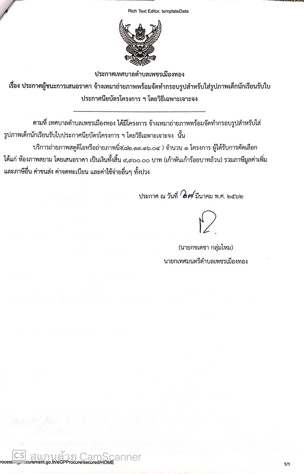 ประกาศผู้ชนะการเสนอราคา จ้างเหมาถ่ายภาพพร้อมจัดทำกรอบรูปสำหรับใส่รูปภาพเด็กนักเรียนรับใบประกาศนียบัตร โดยวิธีเฉพาะเจาะจง |
